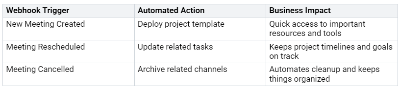 Webhook signals are like triggers that start automatic actions in your Teams Meetings. When certain things happen, like making or changing a meeting, these signals tell your apps to act. Here’s a quick look at how webhook triggers can help your work: