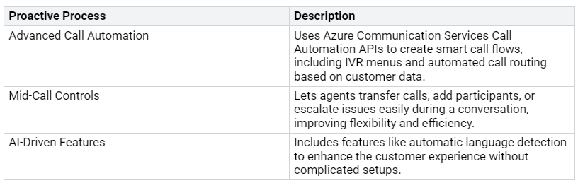 Proactive processes also help make meetings more effective. For example, advanced call automation uses Azure Communication Services to create smart call flows. This includes features like mid-call controls, which let agents transfer calls or add people easily. These tools improve flexibility and efficiency during conversations.