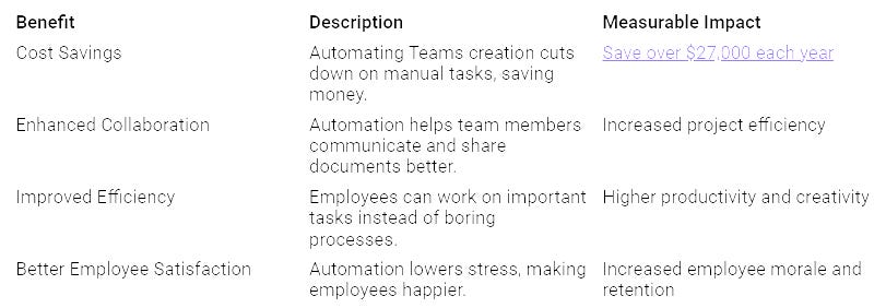 Automation makes it easier to create Microsoft Teams. It saves time and cuts down on manual work. This helps employees focus on their main jobs.