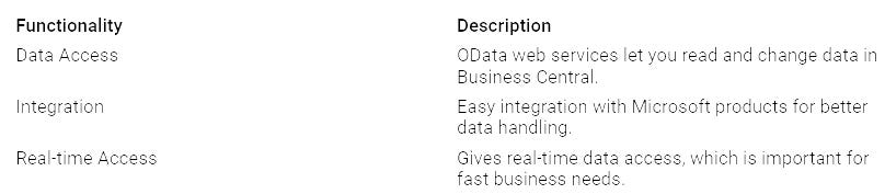 OData APIs, or Open Data Protocol APIs, give flexible access to Business Central data. They let you read and change data easily. Here are some functions of OData APIs: