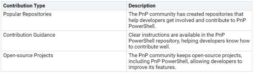 The power of PnP PowerShell comes from its active community. The open-source project encourages developers to help out. Here’s a table showing the types of contributions from the community:
