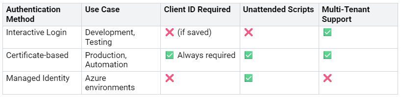 Keeping your cloud environment safe is very important. PnP PowerShell supports different modern authentication methods to keep access secure. Below is a table that shows these methods: