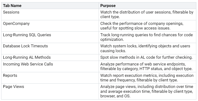By looking at long-running AL methods, you can spot performance problems caused by extensions. The Business Central Server sends out telemetry about execution times, including database interactions. For on-premises setups, you need to set up options like AL Function Timing and AL Function Logging Threshold to access this data well.