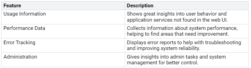 The telemetry dashboard gives you a complete view of your system’s performance. It has many key features that help you see how users behave and how the application performs. Here’s a summary of what you can find: