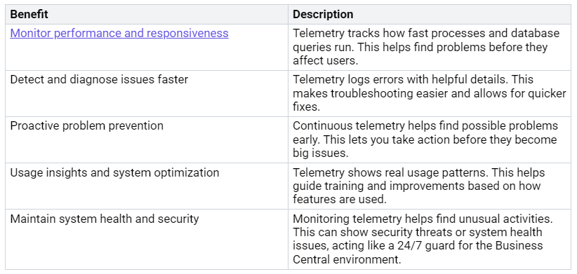 Using comprehensive telemetry in Dynamics 365 Business Central greatly improves your business results. You can watch and fix problems easily. This helps your operations run better.