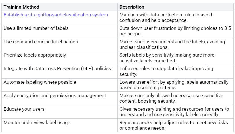 Training is very important for getting users to accept sensitivity labels. You need to give your users the knowledge and skills to use these labels well. Here are some good training methods: