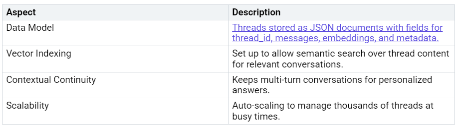 To support multi-turn conversations, Azure Cosmos DB uses a data model that keeps threads as JSON documents. Each document has fields for thread ID, messages, embeddings, and metadata. This setup allows for semantic search over thread content, ensuring your AI agents give relevant answers.