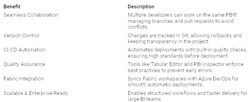 Here’s a quick look at the benefits of using PBIP for structured deployments: