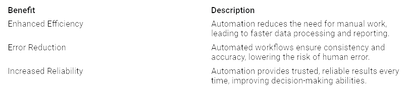Enhanced Efficiency: Automation speeds up data processing and reporting. You won’t need to spend time on repetitive tasks, letting you focus on more important activities.