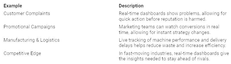 Real-time dashboards can show important business events. For example, they can display sudden increases in customer complaints, letting you fix issues before they grow. Here’s a quick look at how live data can improve different business areas: