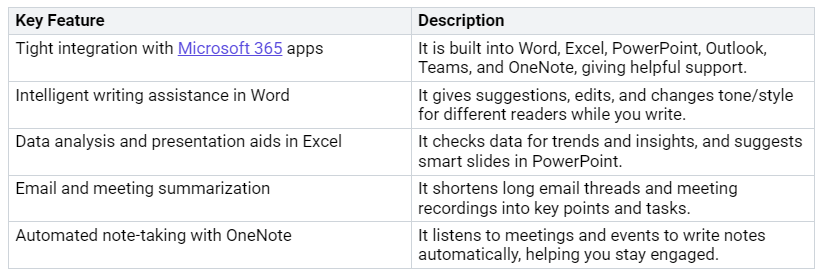 Microsoft 365 Copilot works well with current apps. It gives smart writing help, analyzes data, and takes notes automatically.