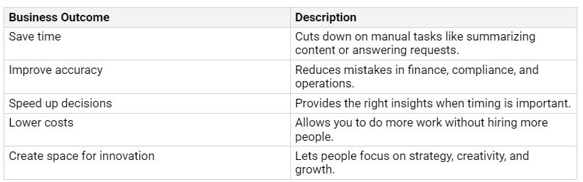 Intelligent agents and copilots can greatly change your business. They help you save time, make fewer mistakes, and make decisions faster. Here’s a quick look at the important results you can expect:
