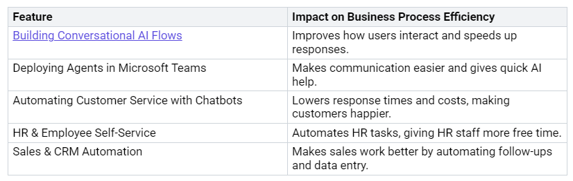 Copilot Studio has many AI-powered automation features. These features help make work easier and faster in different business areas. They help cut down on time spent doing the same tasks over and over. Here are some important functions: