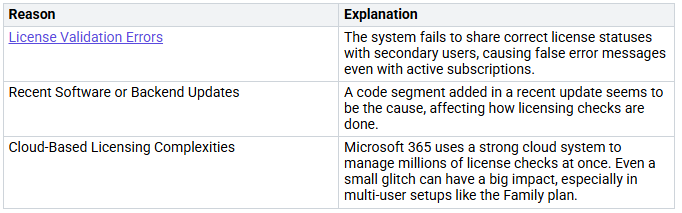 The table below shows some main reasons for automated licensing failures in Microsoft 365: