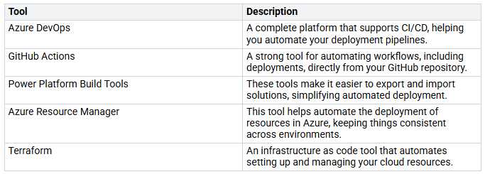 Many tools can help you automate deployments well. Here are some popular tools used in Power Platform pipelines:
