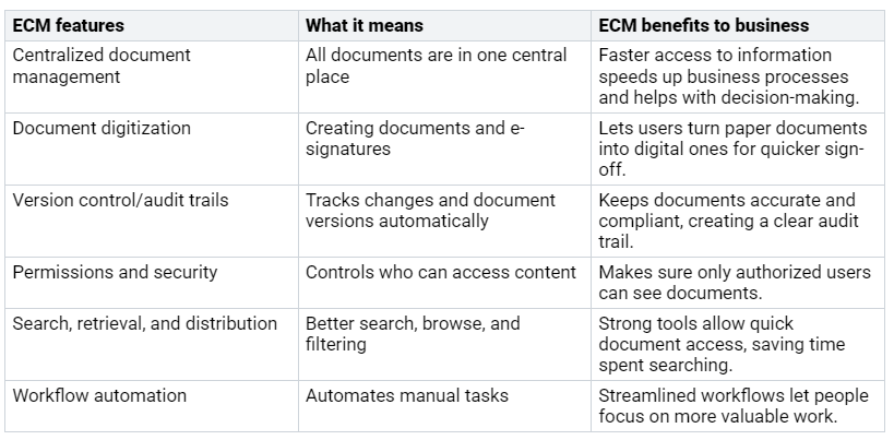 Recent surveys show that organizations see many benefits from ECM features. The table below lists these features and their benefits: