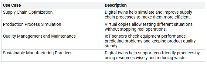 In manufacturing, digital twins are very important for making processes better and boosting productivity. They let you create virtual copies of production lines. This helps with real-time watching and analysis. Here are some common ways digital twins are used in manufacturing: