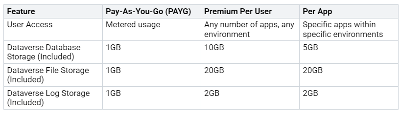 You can also try Pay-As-You-Go (PAYG). You pay for what you use. It includes some basic storage. Some Microsoft 365 apps use Dataverse. They have limited features. They do not allow custom Power Apps. They also do not allow premium connectors. These limits are tied to Microsoft 365 licenses. Users usually get Maker role. This is in the default setting. This is a basic license. It is not a full premium one.