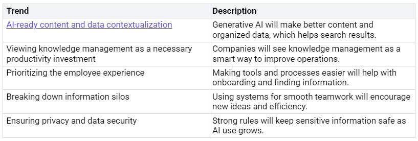 In the future, knowledge management will focus on employee experience, data security, and sharing information better.