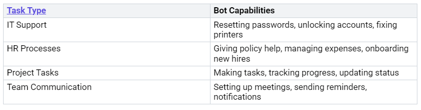 These tools let teams focus on their main jobs instead of getting stuck on small problems. For example, IT support bots can reset passwords. This helps IT workers solve bigger issues.