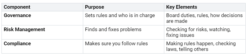 Governance makes the rules. It shows how your company works. Risk Management finds and handles dangers. Compliance ensures you obey all rules. This plan helps you manage your cloud safely.