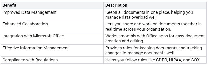 SharePoint keeps all your documents in one spot, which helps manage data better. It lets you work together in real-time, connects with Office apps, and helps follow rules, making sure your documents are safe and easy to find.