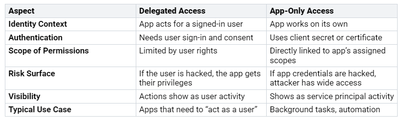 API permissions decide what your application can do with Microsoft services. You can pick between two main types: delegated and application permissions.