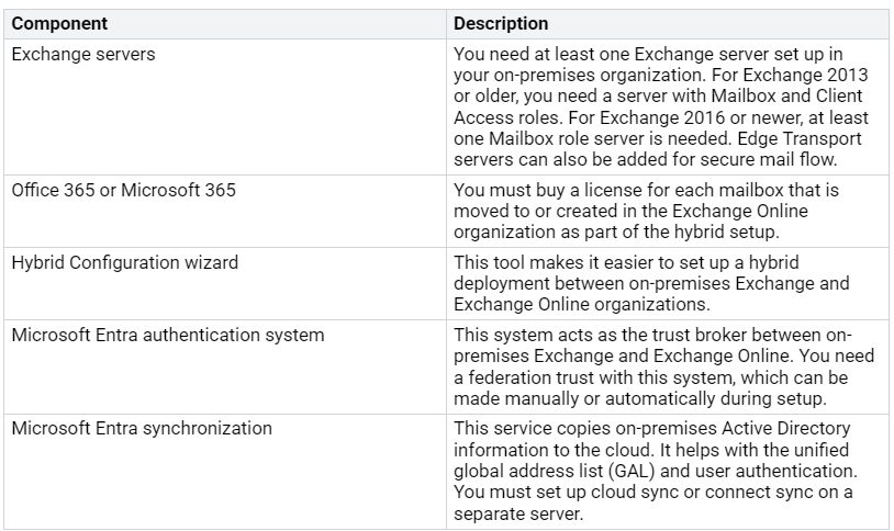 A hybrid exchange environment mixes on-premises Exchange servers with Exchange Online in Microsoft 365. This setup helps organizations use both systems while keeping control of their data. Here are the main parts of a hybrid exchange environment: