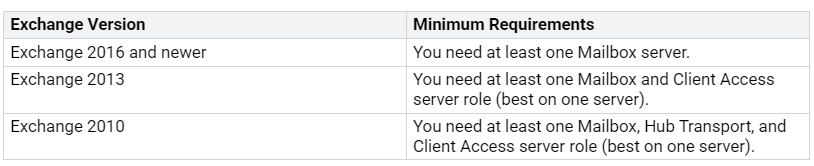 To create a hybrid Exchange environment, your system must meet certain needs. The table below shows the minimum needs based on the version of Exchange you will use: