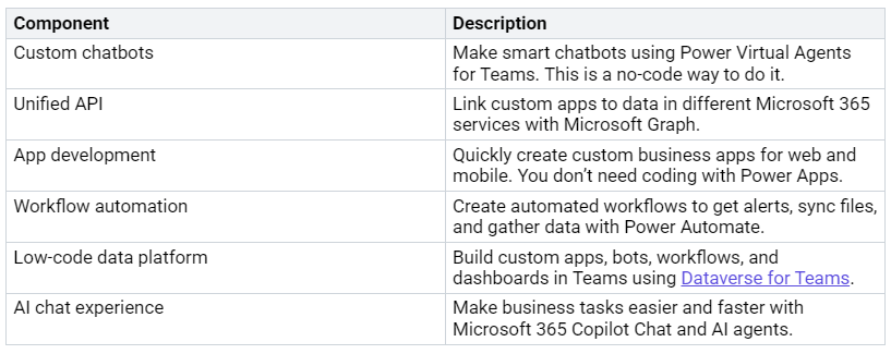 Here are some main parts of Microsoft 365 that you can use to build business solutions: