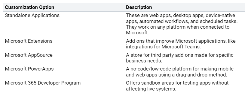 In Microsoft 365 Development, you can customize applications for your organization’s special needs. Customization helps make apps better and improves how users feel about them. Here are some important customization options you can use: