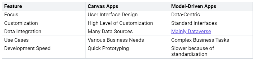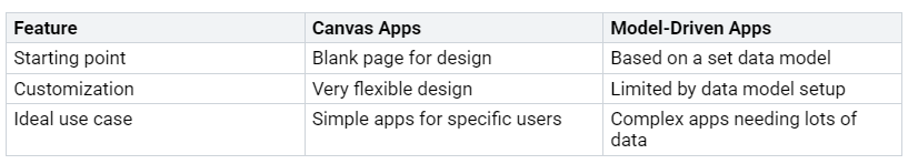 Model-Driven Apps focus on how data is organized and business processes. They have a standard interface, while Canvas Apps give you more freedom to customize and design.