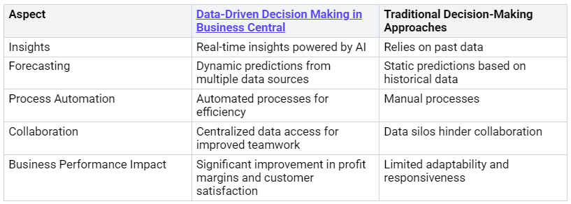 Making decisions based on data in Business Central greatly improves your business compared to older methods. The table below shows the differences: