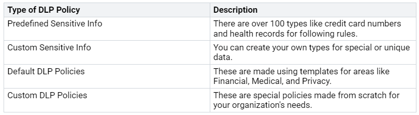 You can set up different data loss prevention (DLP) policies to keep sensitive information safe. These policies stop unauthorized sharing and help you follow rules. Here are some types of DLP policies you can use: