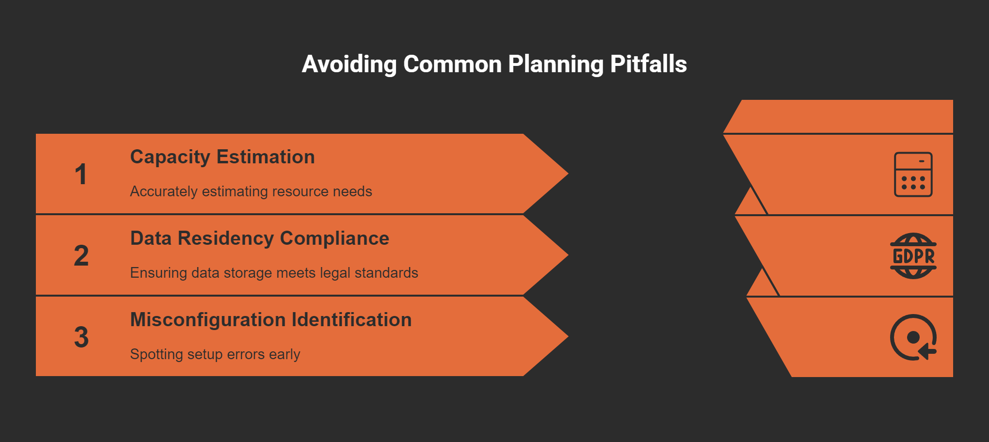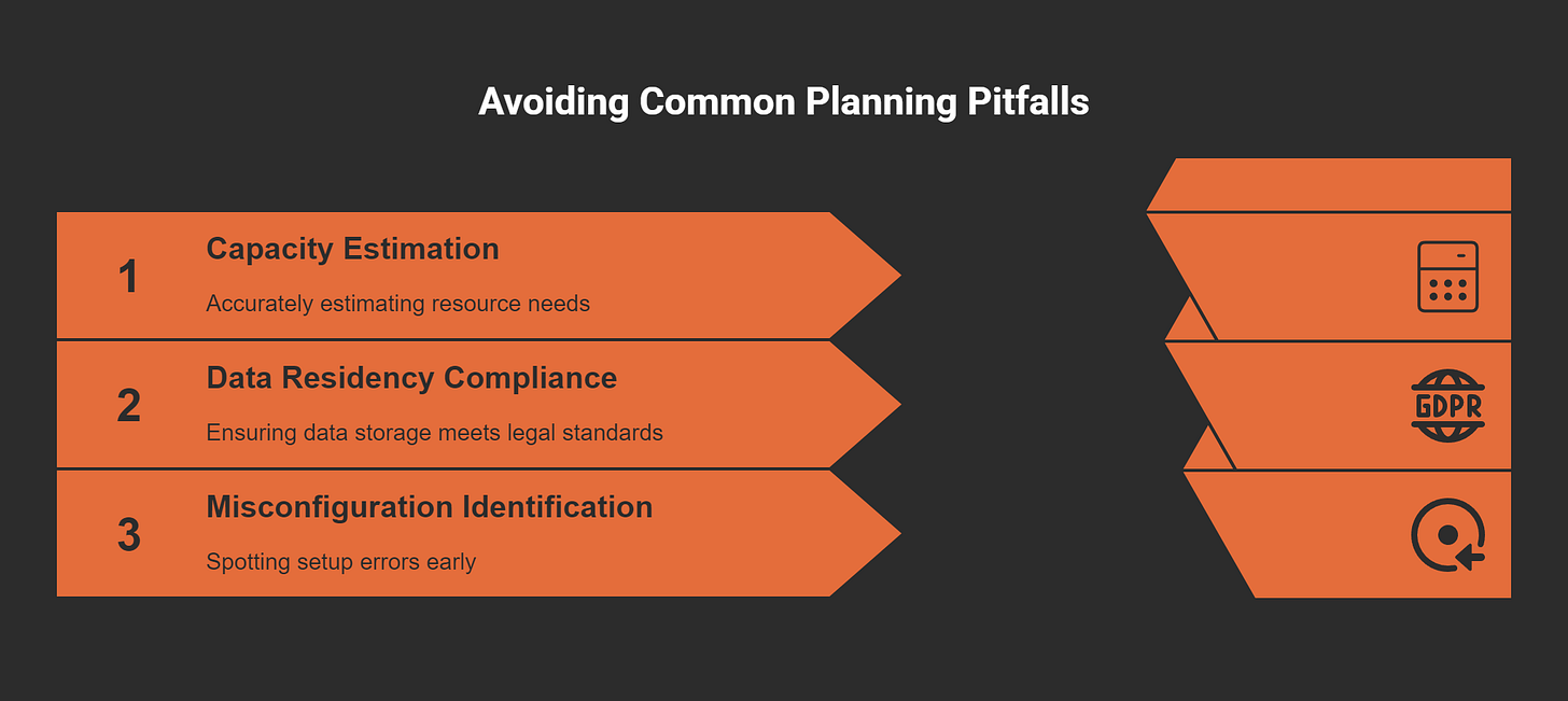 In summary, these common pitfalls highlight the importance of detailed planning in data environments. By avoiding errors in capacity estimation, being mindful of data residency, and identifying misconfigurations early, we set ourselves up for success. Implementing these practices not only saves us time and resources but also enhances our overall productivity. The planning phase might seem tedious, but it’s essential for creating effective, reliable data systems. Let's embrace the learning process and keep striving to improve!