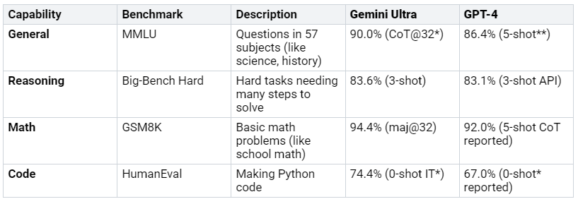 Gemini Ultra is better than GPT-4 at math and making Python code. GPT-4 is better at common sense. Gemini 1.5 Pro and Flash models can take a lot of input. They can handle one hour of video. Or they can handle 700,000 words. Gemini 2.0 Flash remembers much more. It can keep more info for longer talks. Or it can process more info at once. Gemini 2.0-Flash made the fewest mistakes. This shows it is strong in generative AI.