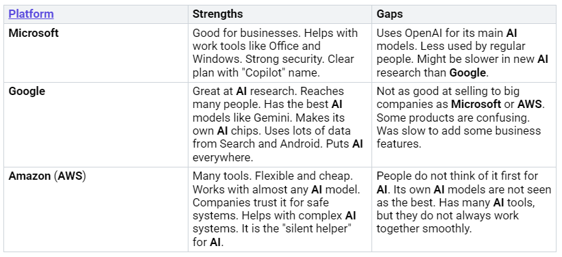 Google uses an ‘AI-first’ plan. It puts good AI like Gemini models into all its cloud products. It is great at AI research. It is also great at multimodal AI.