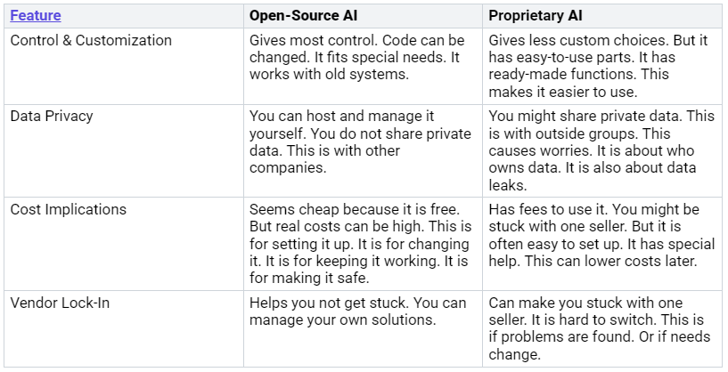 Open-source AI gives the most control. Users can change code. They can make it fit perfectly. This is different from paid options. They offer less custom choices. Data privacy is another big difference. Open-source lets you keep data inside. You do not share private data. Paid AI might share data. This is with outside groups. Open-source seems cheap. But setting it up and keeping it working costs a lot. Paid AI has fees. But it is easier to set up. Open-source helps avoid being stuck. Paid options can make you stuck.