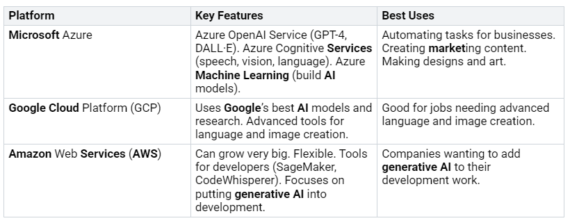 Prices affect what customers choose. Amazon (AWS) lets you pay for what you use. This helps customers save money. They only pay for what they need. It also has discounts for long-term use. Google Cloud often has lower prices. It gives automatic discounts for long use. It also has custom computer types. This can save money for certain jobs. Microsoft Azure has flexible prices. It has options for reserved use. It also has benefits for using existing Microsoft licenses. Big companies often like Microsoft‘s packages. These combine cloud computing, software, and generative AI. Each company tries to have good prices. They also want to offer value for their AI and cloud tools.