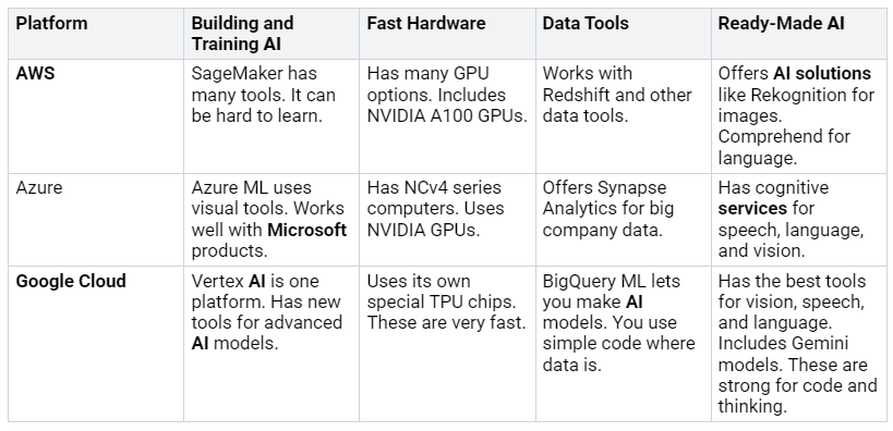 AWS is strongest in regular AI. It started cloud computing early. This gave it a big lead. AWS has many AI services. These include Amazon SageMaker and Bedrock. They help many customers.