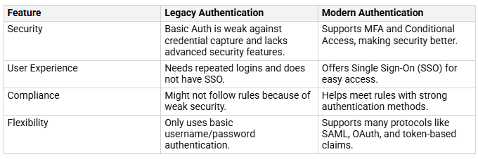 Enhanced Security: Modern authentication includes Multi-Factor Authentication (MFA) and Conditional Access policies. These features help check who the user is and control access based on certain rules.
