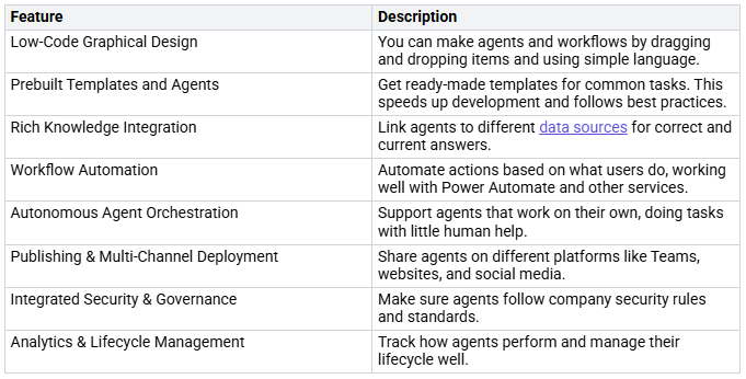 Copilot Studio is a strong tool for quickly making AI projects. It has many features that help you build working AI agents fast and easily. Here are some important abilities: