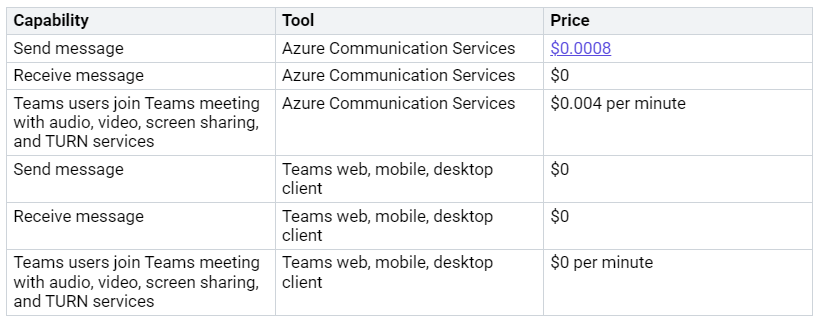 Here’s a look at the prices for key features in ACS and Teams APIs: