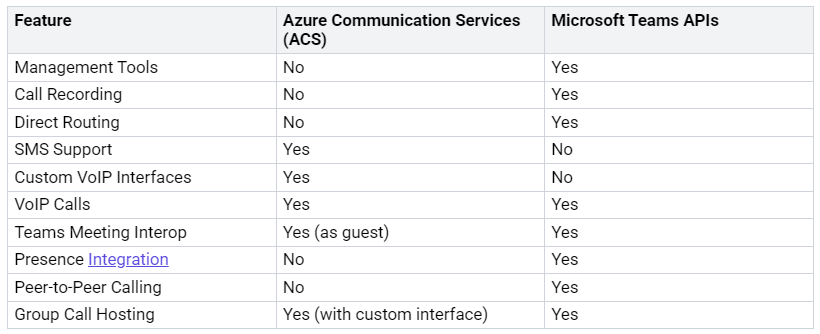 In conclusion, both Azure Communication Services (ACS) and Microsoft Teams APIs have special features for different communication needs. Here’s a simple comparison: