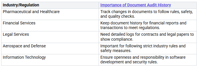 Here’s a table showing why document audit history is important for compliance in different fields: