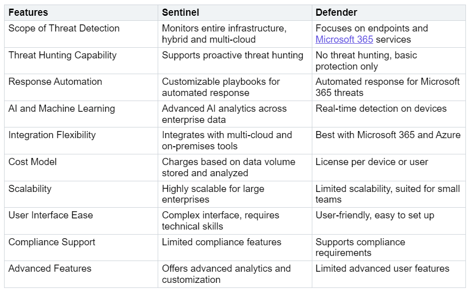 Compare Sentinel and Defender for modern cybersecurity needs.