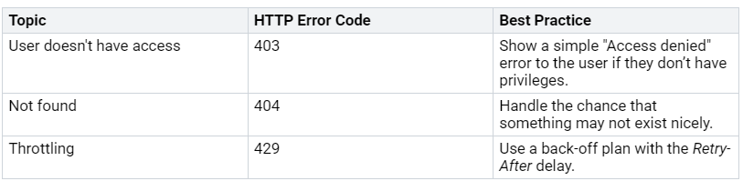Throttling Management: Be ready for throttling responses by using a back-off plan. Use the Retry-After delay to manage requests well.