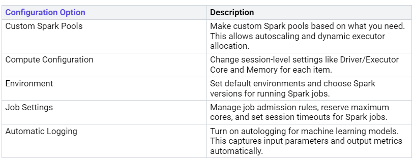 After these steps, you can change your machine learning environment. Here are some options you can configure in Microsoft Fabric: