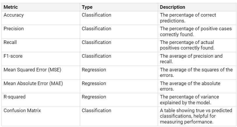 After preparing your data, you start model training and evaluation. This step includes picking the right algorithms, training your models, and checking how well they work. Important ways to measure model performance are: