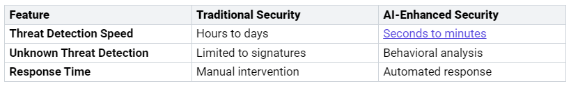AI makes detection and response much faster than traditional methods. The table below shows the differences: